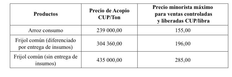“En tal sentido, conforme con las facultades del Consejo de Ministros, se dispone la regulación temporal de los precios máximos de acopio y minoristas de los productos arroz y frijol común (negro, rojo y blanco) de producción nacional, mediante el Acuerdo 10093, del 5 de marzo de 2025, publicado en la Gaceta Oficial de la República (extraordinaria) No. 7, de 7 de marzo de 2025”, precisa la nota.