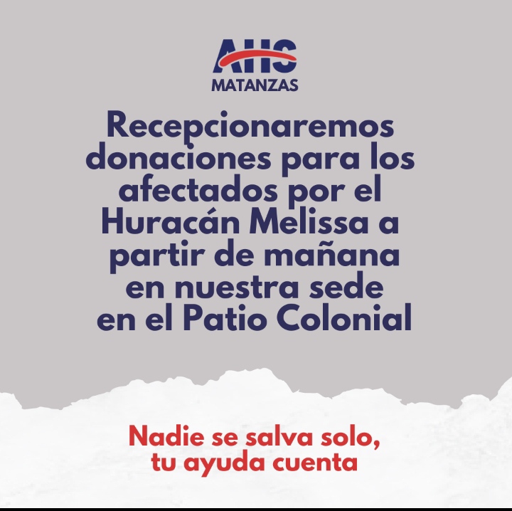 La AHS Matanzas estará recepcionando en su sede del Patio Colonial: ropas, sábanas, juguetes, y alimentos enlatados y sellados, en el horario entre las 9:00 a.m y las 4:00 p.m.