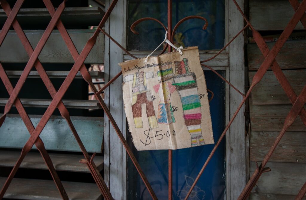 Rosmery tiene necesidades educativas especiales, además, padece de diabetes, miopía y cataratas en un ojo. Milagros la acompaña a exponer sus muñecas en la Casa de la Cultura de la localidad cada vez que hay un evento, y le consigue la tela para que les cosa ropa: “Ahora mi hija es emprendedora, montó un negocio de reparar muñecas y coserles vestidos”, la madre me muestra un modesto cartel en la puerta de la casa que afirma que el servicio cuesta entre cinco y nueve pesos cubanos, según la dimensión de la prenda.