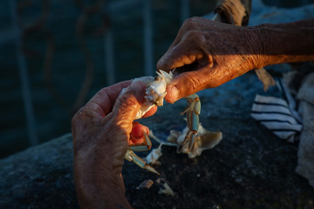 Al rato, la conversación se vuelve cocina. La señora explica el proceso de limpiar la jaiba con detalles quirúrgicos: el cascarón fuera, la “mierda” del medio, la tripita que se esconde entre dos placas. Todo lo dice sin pudor, como quien ha repetido ese gesto miles de veces. Dice que de la jaiba ha hecho sopa. Que alimenta. Que hasta cura. Y pone ejemplos de vecinas que sanaron “porque el médico se lo mandó”.