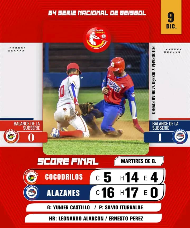 Destaque a la ofensiva para el noveno bate de los Alazanes de Granma, Ernesto Pérez, con sencillo, cuadrangular y dos carreras empujadas, y Leonardo Alarcón con batazo de vuelta completa para decantar el juego en favor del conjunto del oriente del país.