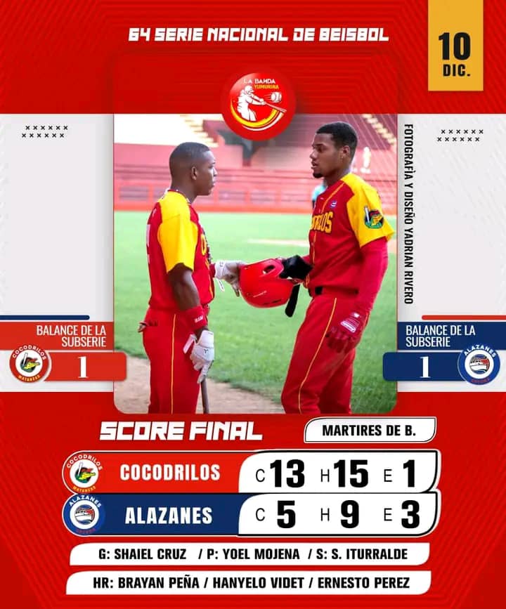 En un desafío de predominio ofensivo, los Cocodrilos de Matanzas derrotaron a los Alazanes de Granma con marcador de 13 carreras por 5 para igualar la subserie particular a un triunfo por bando.