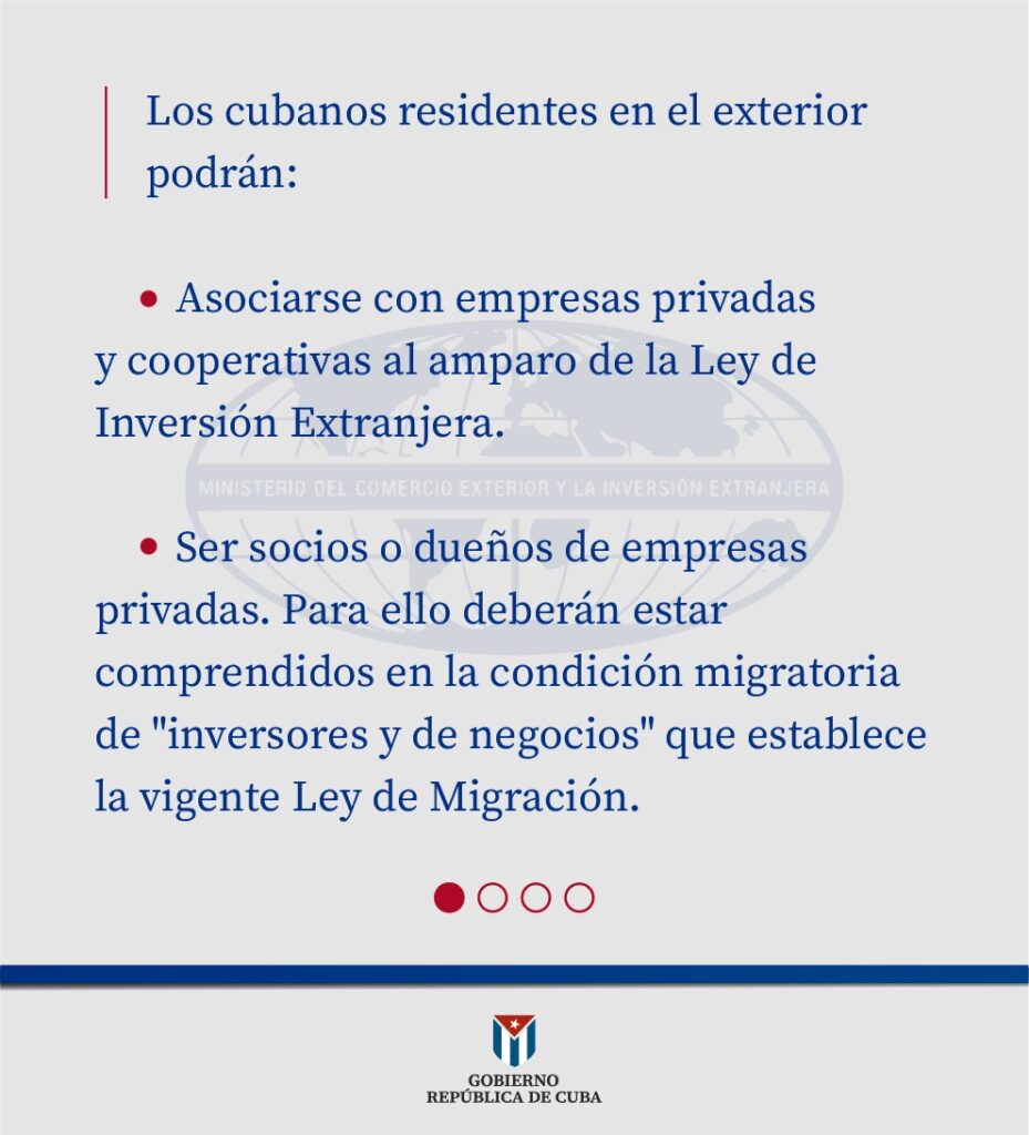 Asimismo, se permitirá que estos ciudadanos puedan asociarse con empresas privadas cubanas mediante diferentes modalidades empresariales, así como establecer alianzas con entidades cubanas tanto estatales como privadas, lo que amplía las posibilidades de cooperación económica.