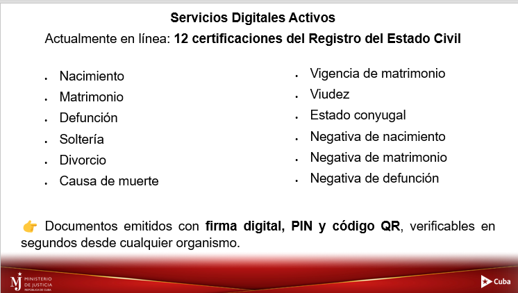 Para ello hay 15 servicios, que son las 12 certificaciones de registro de estado civil. Por ejemplo, la. certificación de nacimiento, matrimonio, defunción, viudez, son 12, alrededor de 12. Y están los tres servicios que tienen que ver con la identidad del ciudadano, que es el carnet de identidad, la licencia de conducción y la circulación de vehículos por concepto de pérdida o deterioro.