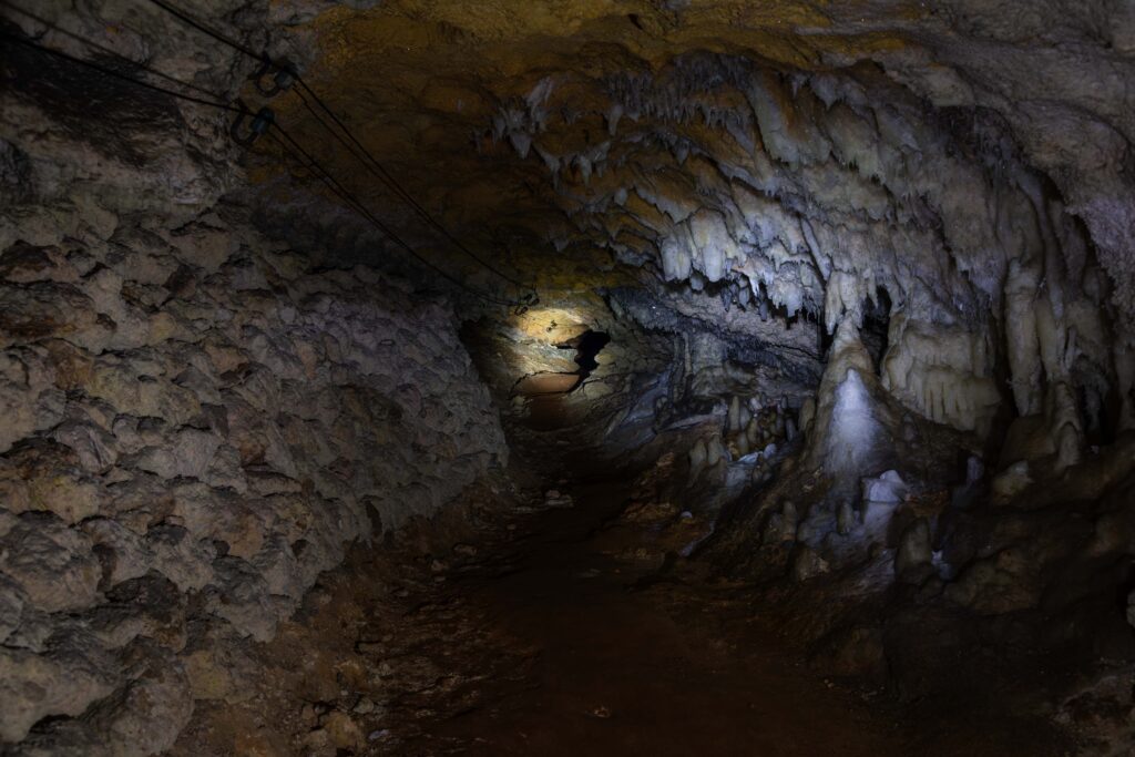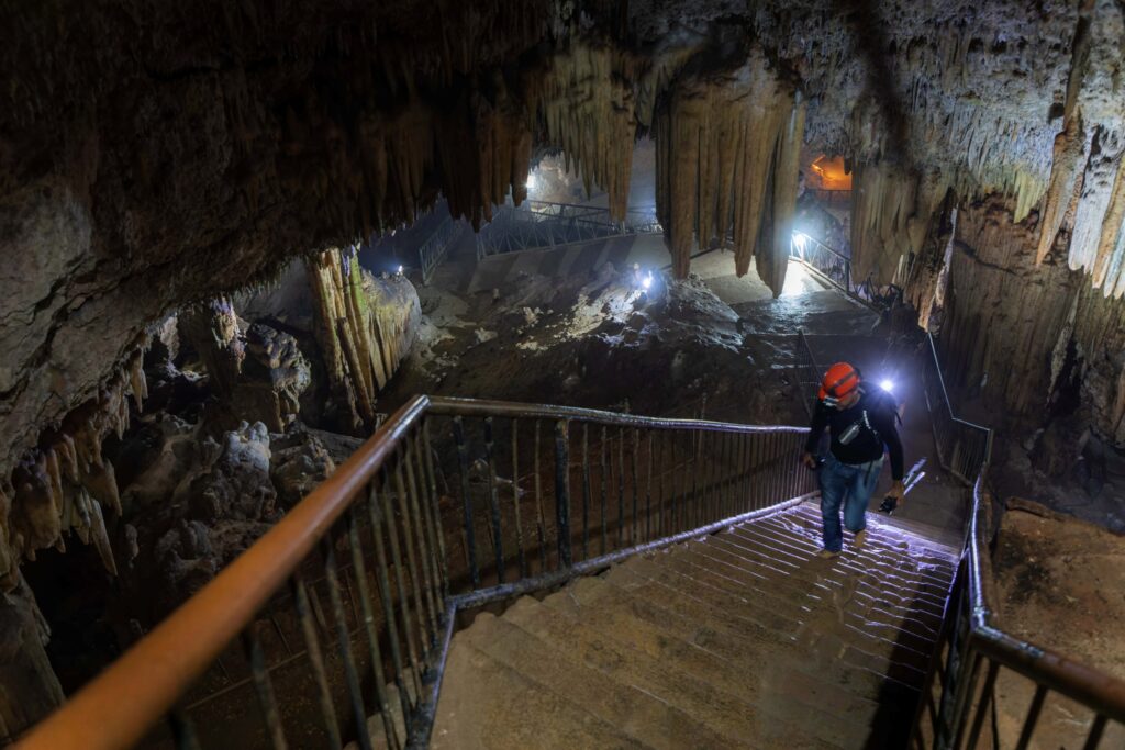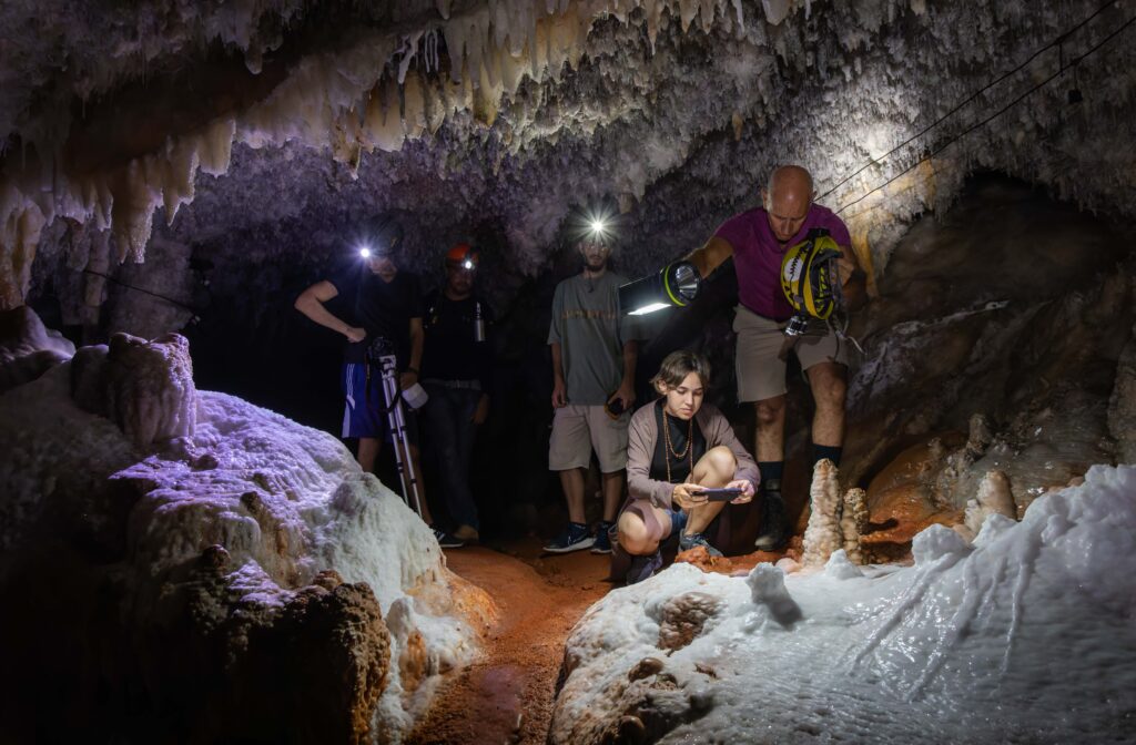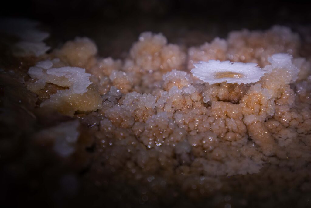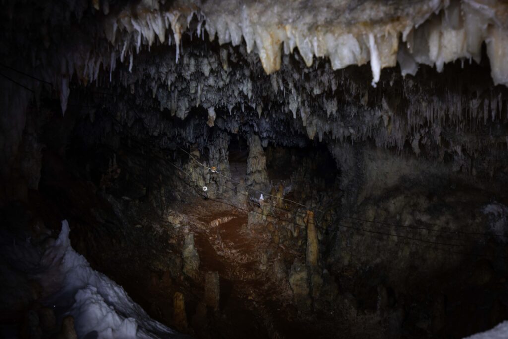 Cada rincón del salón es una lectura del pasado: estalactitas que descienden lentamente desde el techo, estalagmitas que ascienden desde el suelo, y columnas que marcan el encuentro de ambas en un proceso aún vivo. En algunas superficies, una capa cristalina devuelve destellos inesperados, evidencia de antiguas inundaciones que sellaron la roca con un brillo casi irreal. Es un espacio donde la ciencia y la estética convergen, ofreciendo una escena que desafía la percepción del tiempo.